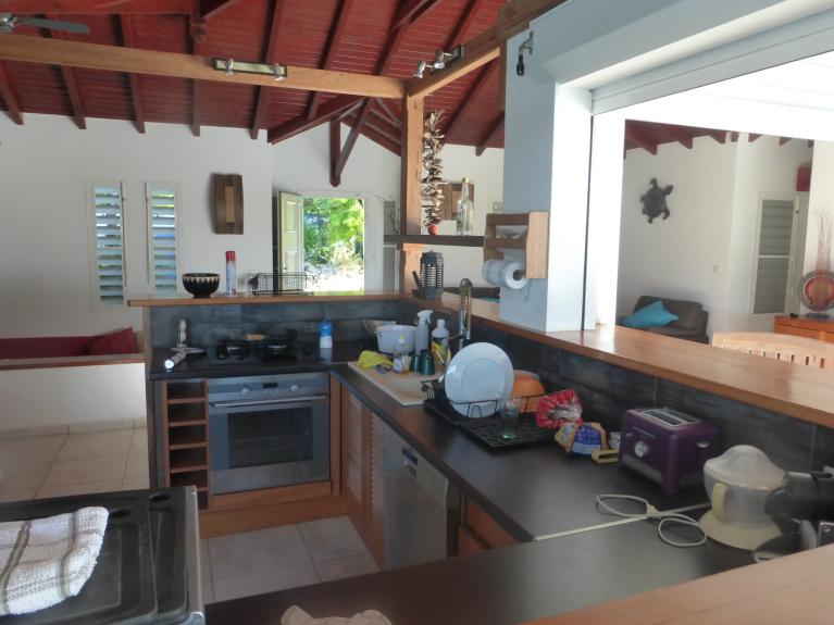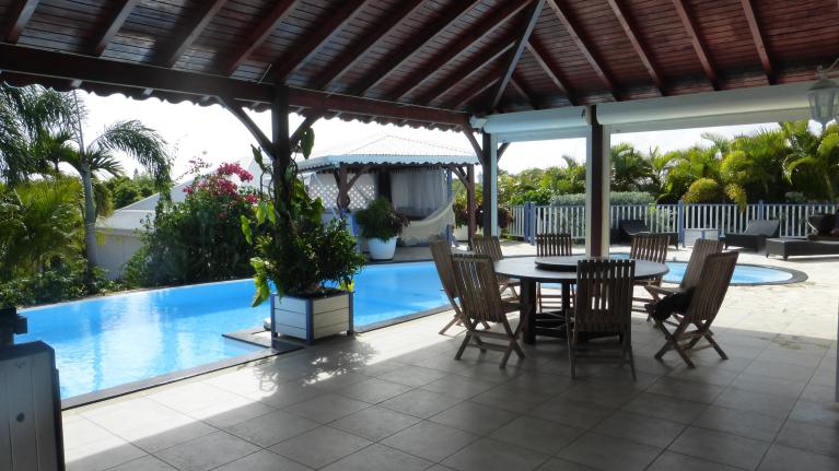 la terrasse couverte avec sa grande table ronde [jusqu'à 10 personnes], vous attend pour prendre vos repas face à la piscine et au jardin paysagé et vous profiterez en plus de la magnifique vue sur les iles de Petite Terre et de Marie-Galante